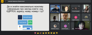 І разом із фахіцем Говерли Дмитрієм Лавріненко, здобувачі освіти групи 577-М заглибились у розгляд цієї тематики з різних сторін, познайомилися теоретично та практично щодо застосування: e-data.gov.ua (інформація про бюджет у формі відкритих даних); Prozorro та Dozorro; Clarity Project, You Control та Open Data.